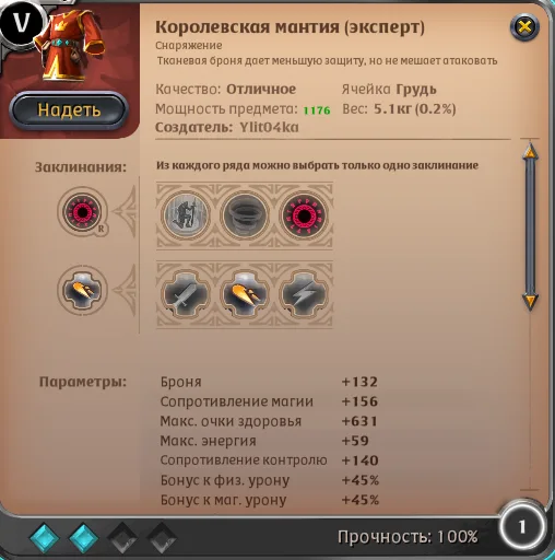 Теперь переходим к мантии, я лично использую “Королевская мантия”, за счет последнего заклинания увеличивается магический урони и исцеление, очень сильно помогает в подземельях, пассивку берем на время чтения заклинаний: