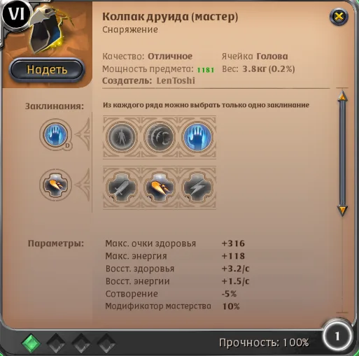 Далее шапка, тут нам нужен “Колпак друида”: